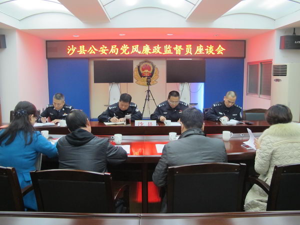 为增进警民互信,吸纳社会建议,敞开沟通渠道,加强社会监督,2016年12月30日下午15时,沙县公安局在八楼会议室召开党风廉政监督员座谈会,邀请了沙县人大、政协、政法、社区、企业、学校等8名代表参会,沙县公安局局党委副书记陈家贵、党委委员、副政委王玉贵、监察室主任苏建华、督察大队长郑建明出席会议。